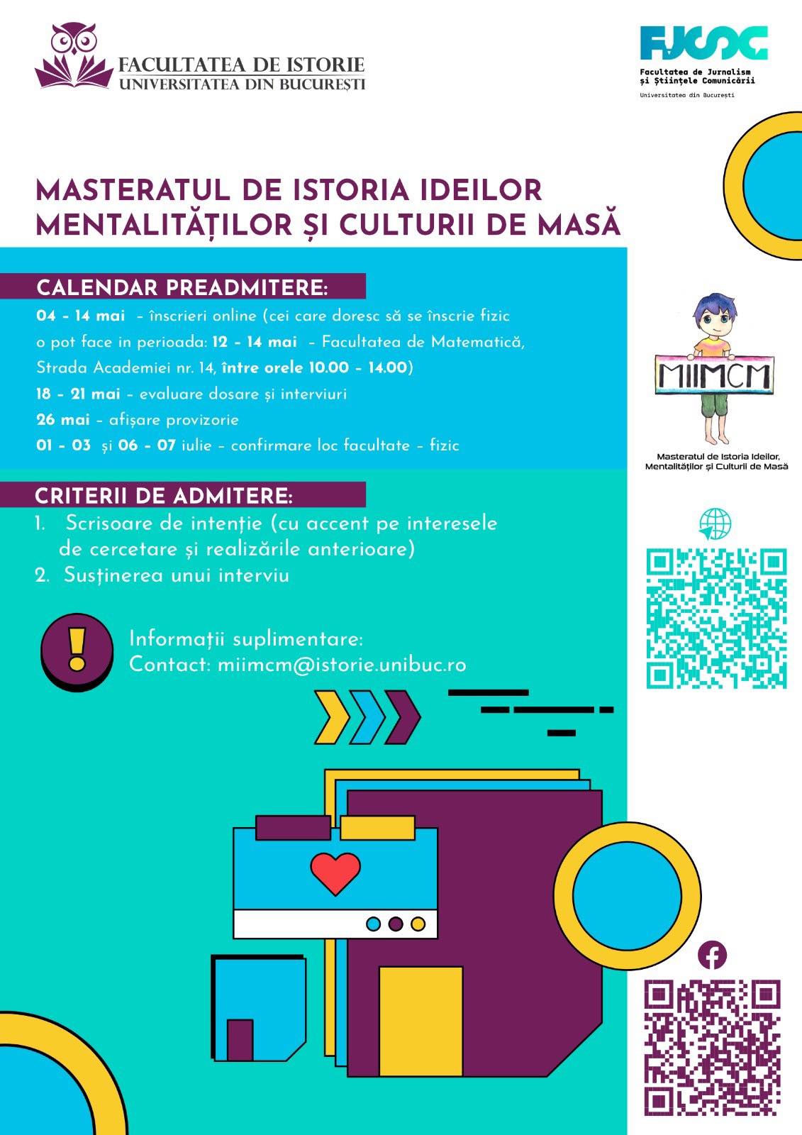 Încep pre-înscrierile la programele de Master şi ocazia asta vă recomand Masterul pe care îl urmez eu, Istoria Ideilor, Mentalităților și a Culturii de Masă (sec. XIX – XXI). Admiterea se face pe bază de dosar + interviu, sunt 12 locuri la buget şi 30 la taxă. Dacă aţi mai făcut un master deja, vă încadraţi doar pentru locurile la taxă. Dar vorbim de 5000 de lei pe an, nu e o avere.