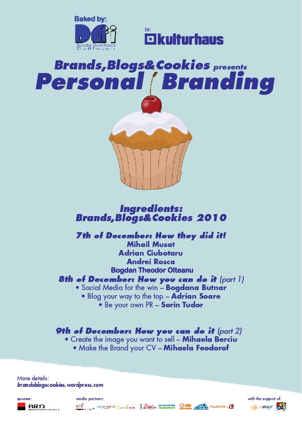 Acum 2 ani Brands, Blogs and Cookies a însemnat un experiment mişto cu branduri făcut de Bogdana, a însemnat o dezbatere despre şcoala de comunicare din RO cu Sorin Tudor, a însemnat poveşti cu cartofi prăjiţi de la Andrei Roşca şi Bobby, a însemnat poze şi autografe date de Cabral pentru toate femeile de serviciu din ASE. Tot atunci s-a născut Prăjiturel, o trăznaie a noastră, care s-a transformat în studiu de caz pentru promovarea de ONGuri.