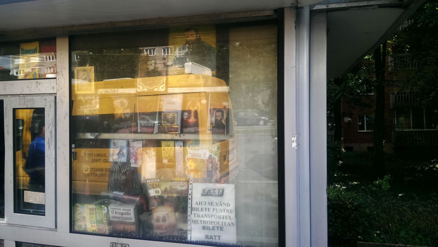 Mă plimbam prin Timişoara săptămâna trecută când mi-au picat ochii pe acest chioşc. Soarele era puternic, graba mare, n-am reuşit să scap de reflexie, dar se distinge cam ce era în vitrină. M-am oprit să admir şi eu primul magazin oficial „Arsenie Boca”. Ştiam că lucrurile au evoluat, dar nu ştiam că s-a ajuns chiar la magazine oficiale! Pe urmă mi-am dat seama că mă aflam în faţa unui chioşc de ziare. Dar cum ziare şi reviste nu prea mai sunt, iar Arsenie Boca se vinde mai bine, şi cealaltă jumătate a vitrinei era „tapetată” cu cărţi despre Arsenie Boca. Mă mir că mai există acel anunţ cu biletele pentru RATT, în curând cred că va fi înlocuit cu anunţ pentru bilete la pelerinaje.