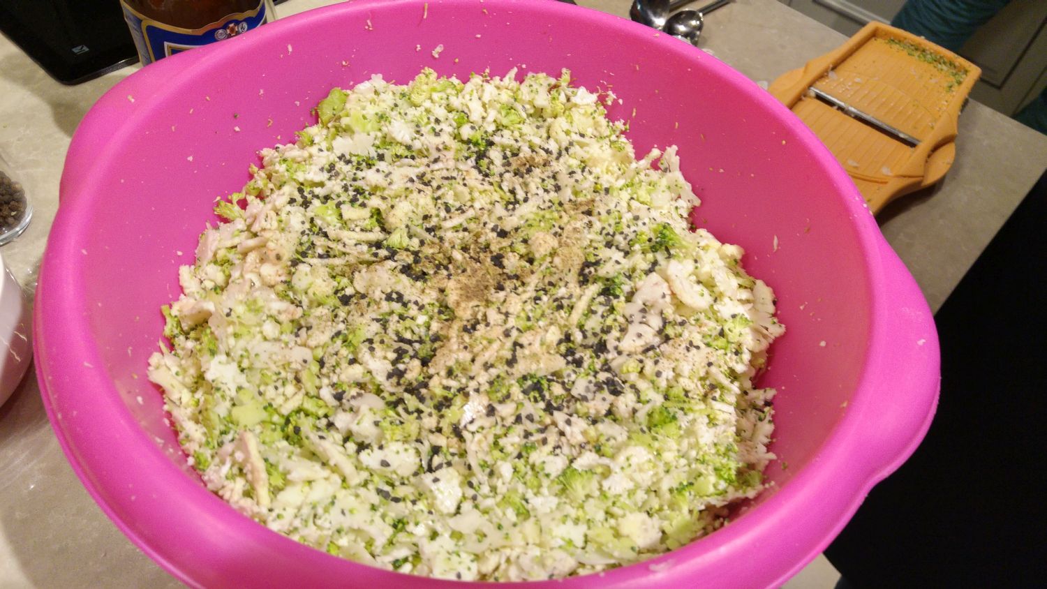 Dacă vreţi să citiţi despre alte reţete, musai să vedeţi ce a gătit Vlad, muşchiul de porc a fost umplut demenţial. Cât despre salata de conopidă şi brocolli, ea arată cam aşa şi se prepară extrem de simplu. Trebuie doar să radeţi cele două legume, să adăugaţi sare (în imagine e sare neagră), piper şi nişte oţet balsamic. Iese yum!