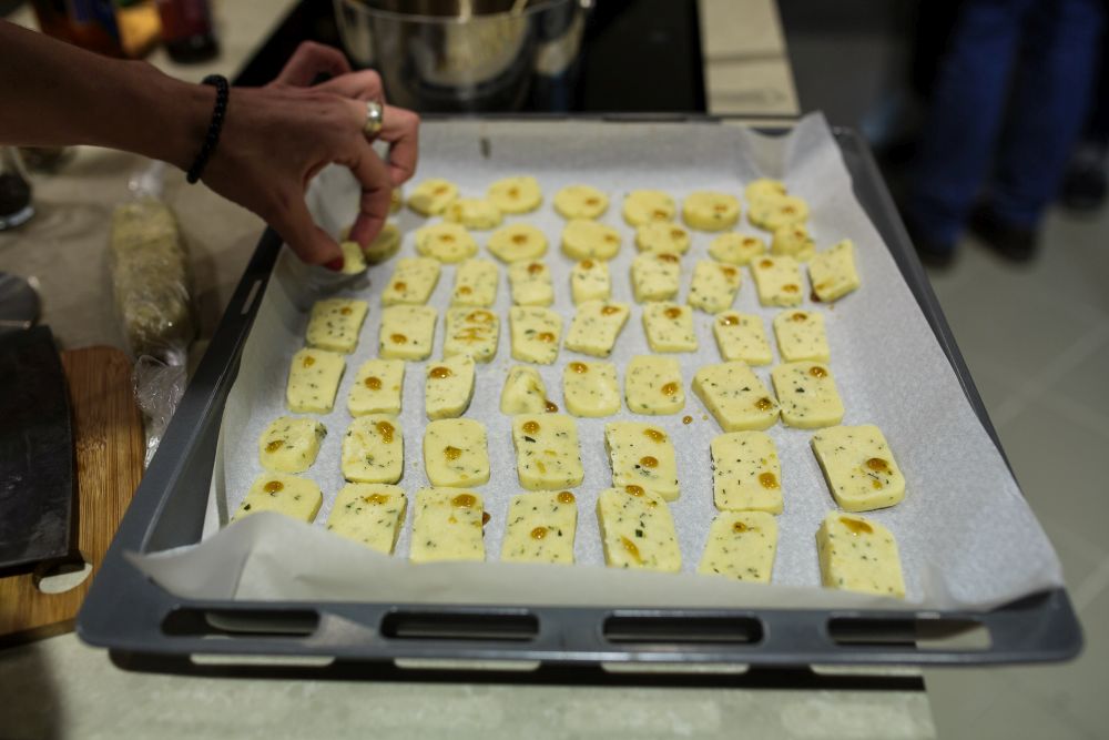 Rondelele se pun într-o tavă pe care e deja întinsă hârtia de copt şi apoi se bagă la cuptor. 6-8 minute la 180 de grade şi gata, ai făcut nişte super biscuiţi care merg cu bere.