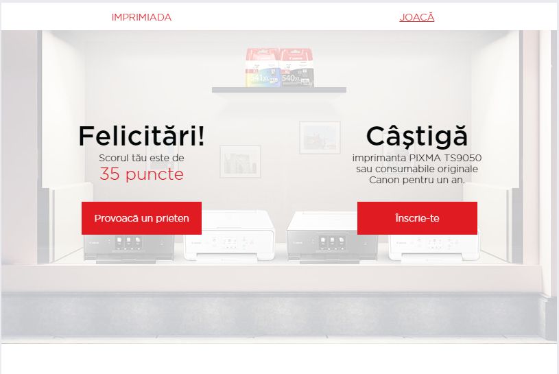 După ce vă jucaţi şi obţineţi puncte va trebui să vă daţi nişte date de contact pentru a se valida înscrierea. Câştigătorii vor fi anunţaţi pe 14 februarie. Nu trebuie să fiţi campioni, e tragere la sorţi pentru toţi cei care se înscriu cu datele de contact, dar ţineţi cont că eu am reuşit 35 de puncte 😀 Şmecheria este să luaţi cartuşul de pe raft cât mai repede şi să aşteptaţi să apară semnul pe imprimantă.
