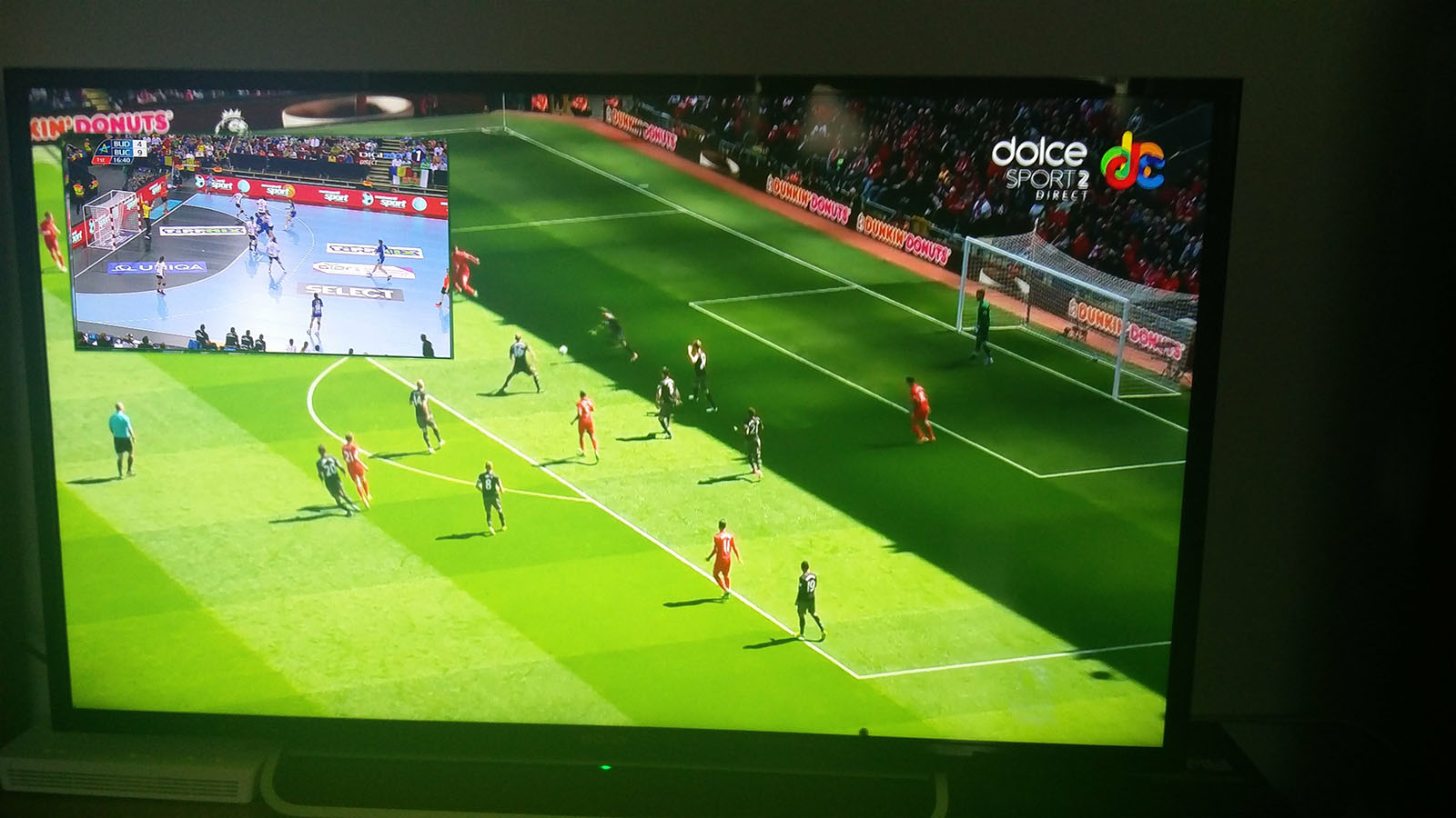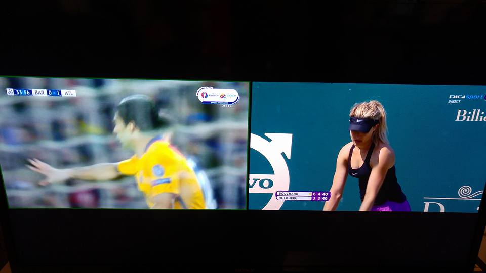Partea bună e că Sony a mai inventat şi conceptul Picture and Picture, care e mult mai ok. O mostră mai jos. Pierzi destul de mult din ecran jos şi sus, dar măcar poţi să urmăreşti ambele canale.