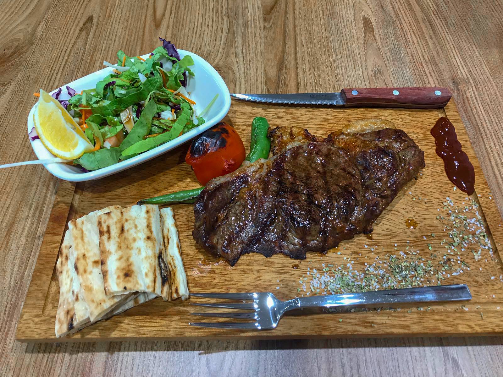 Cum ziceam, oferta e destul de variată: T-Bone, cotlet de vită, cotlet de berbecuţ, antricot şi alte tipuri de friptură, plus adana kebap, lahmacun, frigărui de vită şi alte chestii arăbeşti. Preţurile nu sunt mici, însă vorbim de un segment ceva mai premium. Fast-food premium, cum ar veni. Din păcate n-am notat, dar o să revin cu un update legat de preţuri. Tot ce-mi amintesc e că am dat 30 de lei pe ceea ce vedeţi mai sus, adică o porţie de adana kebap. Cu tot cu salată şi acea porţie de ceapă cu boia. Restul preparatelor erau mai scumpe de atât.