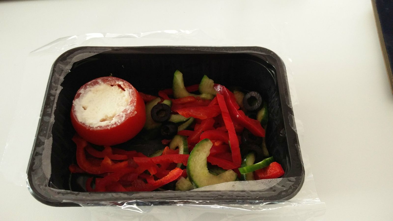 La 17:00 alt fruct şi pe la 19:00 deja am intrat în salata de roşii umplute (mă rog, era o roşie medie umplută cu cremă de brânză) şi cu nişte măsline. În fluturaş erau anunţaţi şi nişte crackers, dar nu i-am găsit. Din nou, decent, mai ales dacă aş vrea să ţin cură de slăbire.