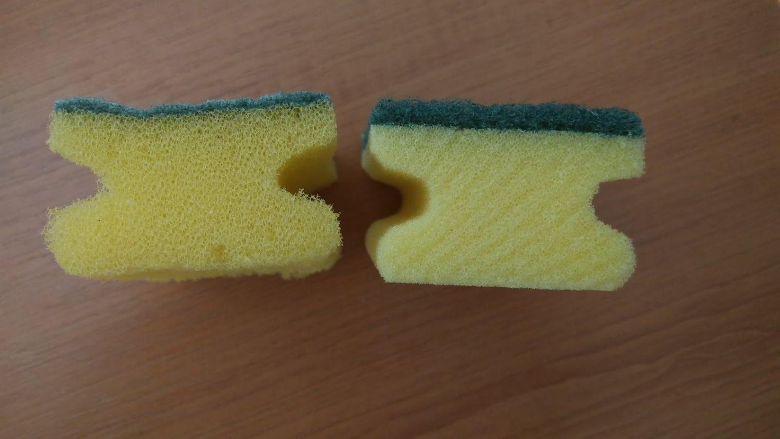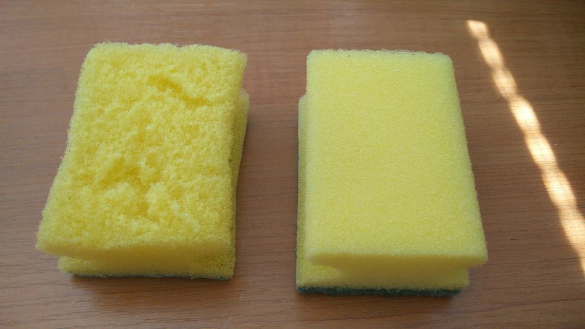 Cam atât de rău. După 3 săptămâni de utilizare (şi nu locuiesc într-o popotă, totuşi) buretele ieftin e aproape gata. Dacă ne uităm mai atent vedem şi de ce. Cel la 6 lei e mai dens, partea dură e mai groasă şi probabil că îl voi folosi 2-3 luni (ceea ce se traduce prin 10-12 spălări de vase sau ceva de genul :)) ).