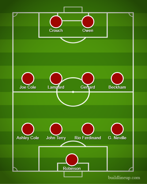 Generaţia din 2006 cred că a fost cea de la care englezii au avut cele mai mari aşteptări. Owen, Rooney, Joe Cole, Lampard, Gerrard, Beckham, plus John Terry lângă Rio Ferdinand. Singura verigă slabă a fost postul de portar, ocupat de Paul Robinson. Tot în sferturi au ieşit englezii, la penalty-uri contra Portugaliei. Au ratat Lampard, Gerrard şi Carragher (care intrase fix ca să bată penalty-uri, în minutul 119).
