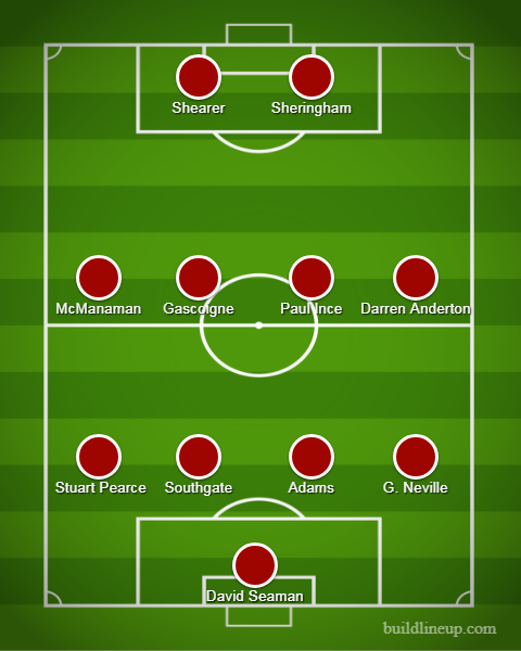2 ani mai târziu, echipa Angliei care juca semifinale la Euro îi avea în primul 11 pe Gareth Southgate (actualul selecţioner al echipei), Paul Gascoigne, Paul Ince, Alan Shearer şi Teddy Sherringham, plus David Seaman în poartă.