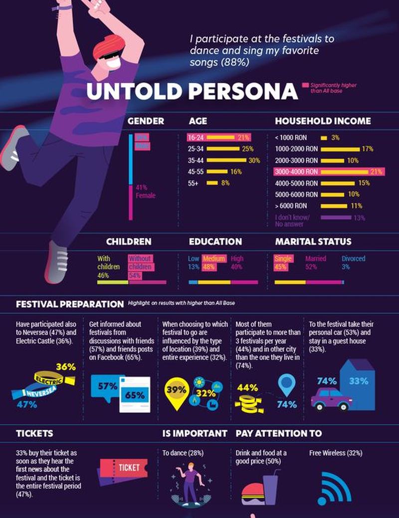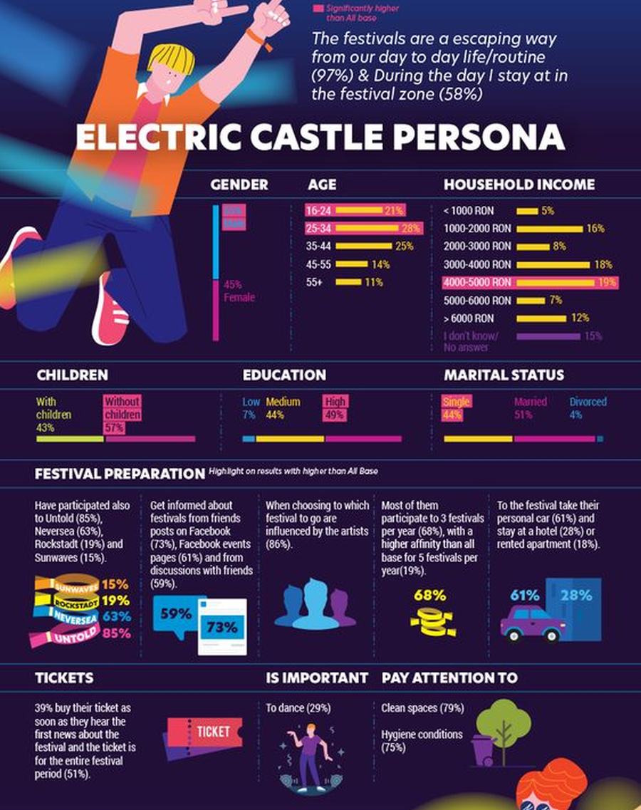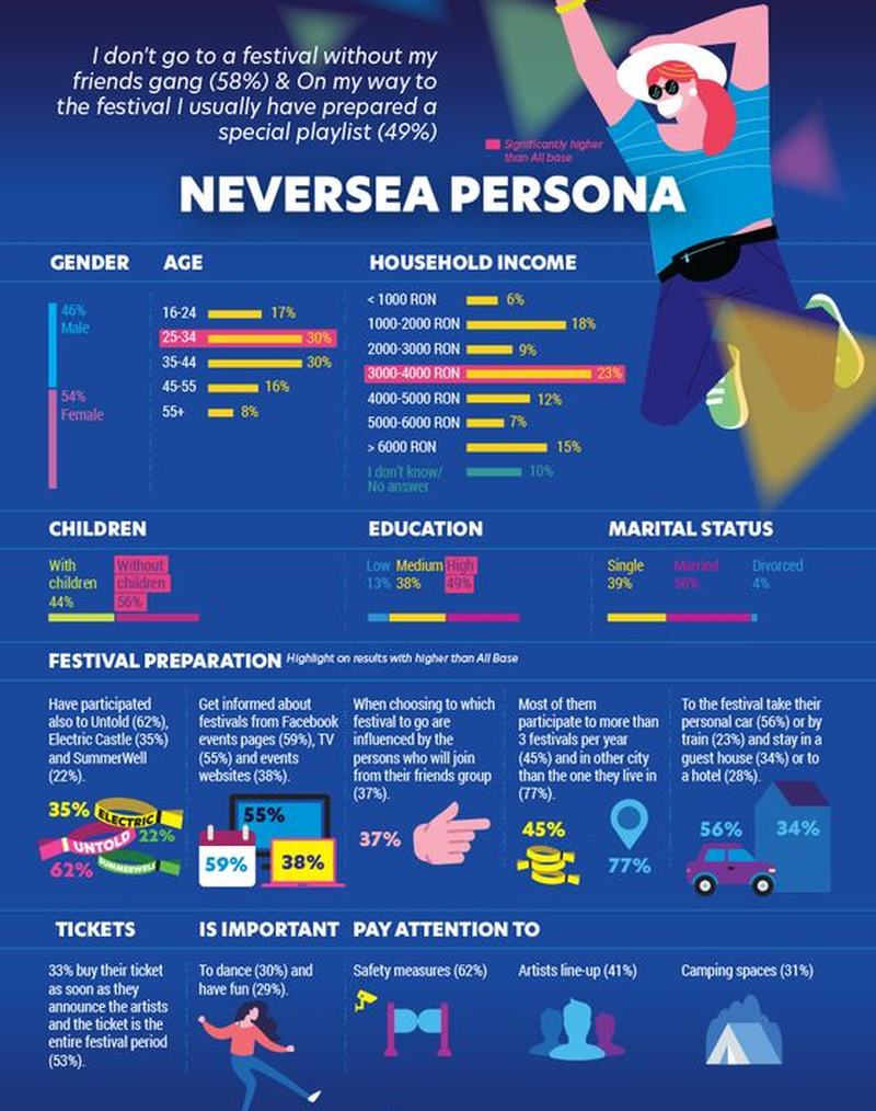 - puţin surprinzător că la Untold şi Electric Castle sunt mai mulţi bărbaţi, în timp ce la Neversea procentele sunt mai echilibrate. Probabil că vin mai multe puştoaice acolo pentru că e mai uşor să-i rogi pe părinţi să te lase la mare.
