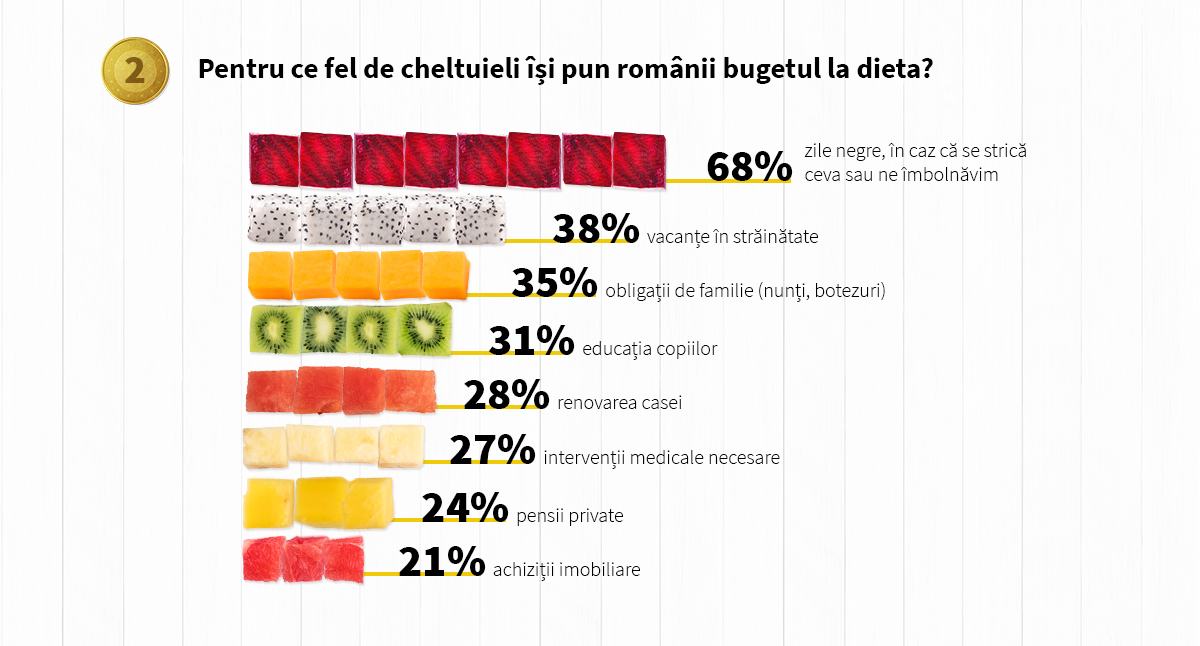 Doar 1% dintre români declară că sunt relaxaţi financiar, adică pot face faţă oricărei cheltuieli. 40% dintre români suferă lipsuri financiare (5% nu au bani nici pentru a acoperi strictul financiar, 35% renunţă la lucruri pentru a face faţă cheltuielilor zilnice). Din aceşti 40%, cei mai mulţi sunt persoane între 45 şi 50 de ani, din zonele Crişana-Maramureş şi Oltenia.