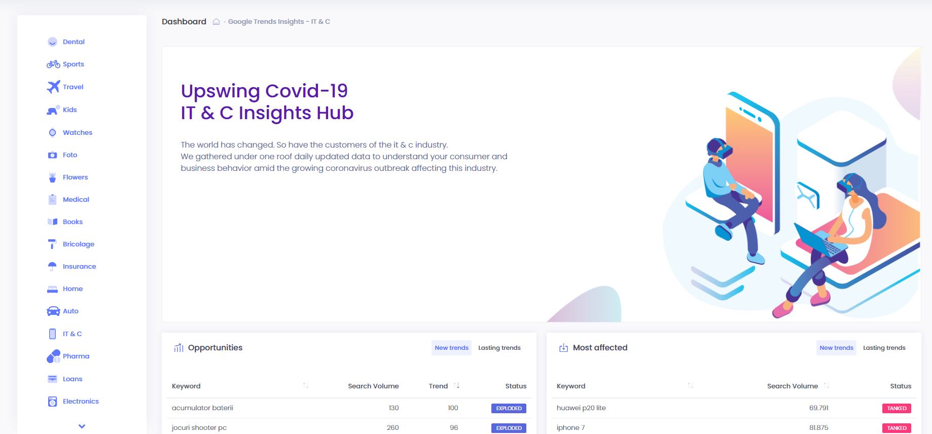 Mergând pe aceeaşi idee, au lansat acum acest Upswing Covid-19 Data Insights Hub. E un tool care trage informaţii din Google Trends şi îţi arată ce cuvinte cheie au avut creşteri importante în ultima vreme pe diverse categorii. Pentru că e clar că acolo e cererea mare, aşa că poate vă adaptaţi businessul sau vă îndreptaţi atenţia acolo.