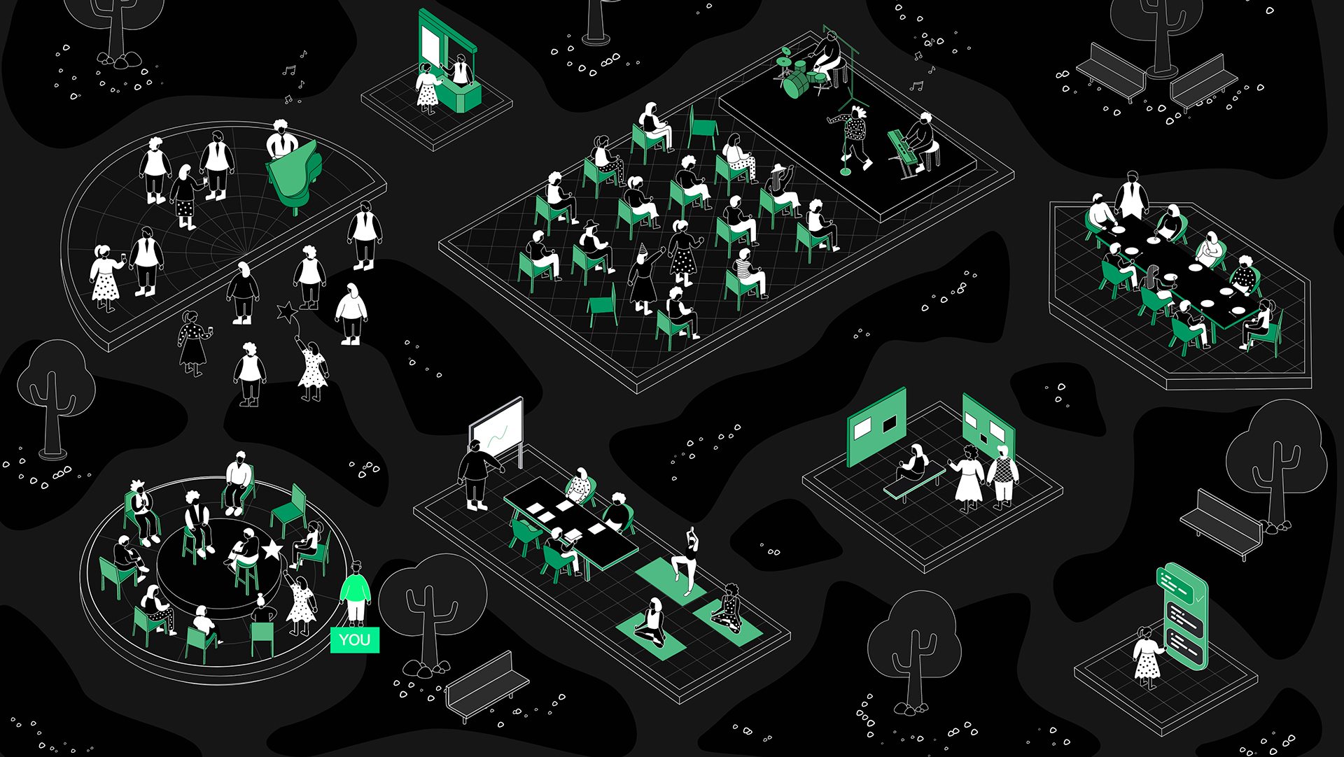 Pe scurt, puteaţi interacţiona cu oameni aleşi la întâmplare de un algoritm, puteaţi lua masa alături de alţi 3 participanţi, puteaţi pur şi simplu să vizionaţi prezentările de pe scena principală sau să dialogaţi text sau video cu diverse grupuri de oameni. Am văzut şi oameni care s-au plâns că varianta asta e prea intruzivă, că organizatorii îţi cer acces la video şi audio din casa ta, din spaţiul tău personal, pe tot parcursul evenimentului. Mi se pare că e fix ca la un eveniment real. Cei care sunt deschişi spre dialog vor intra să vorbească random cu străini, aşa cum intră în vorbă şi la eveniment, în timp ce restul vor prefera să rămână „într-un colţ”.