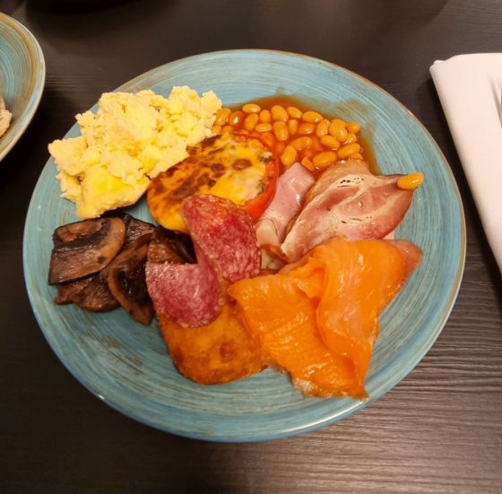 Am ajuns și la micul dejun, care mi-a fost lăudat intens. Iarăși m-am dus cu niște super așteptări și aproape că au fost confirmate. Spun aproape, pentru că am văzut niște mici scăpări. De exemplu bagheta era pusă într-un coș, să-ți tai singur, dar nu exista vreo mănușă specială, am luat eu unul dintre prosoapele de pe acolo ca să nu țin bagheta cu mâna.