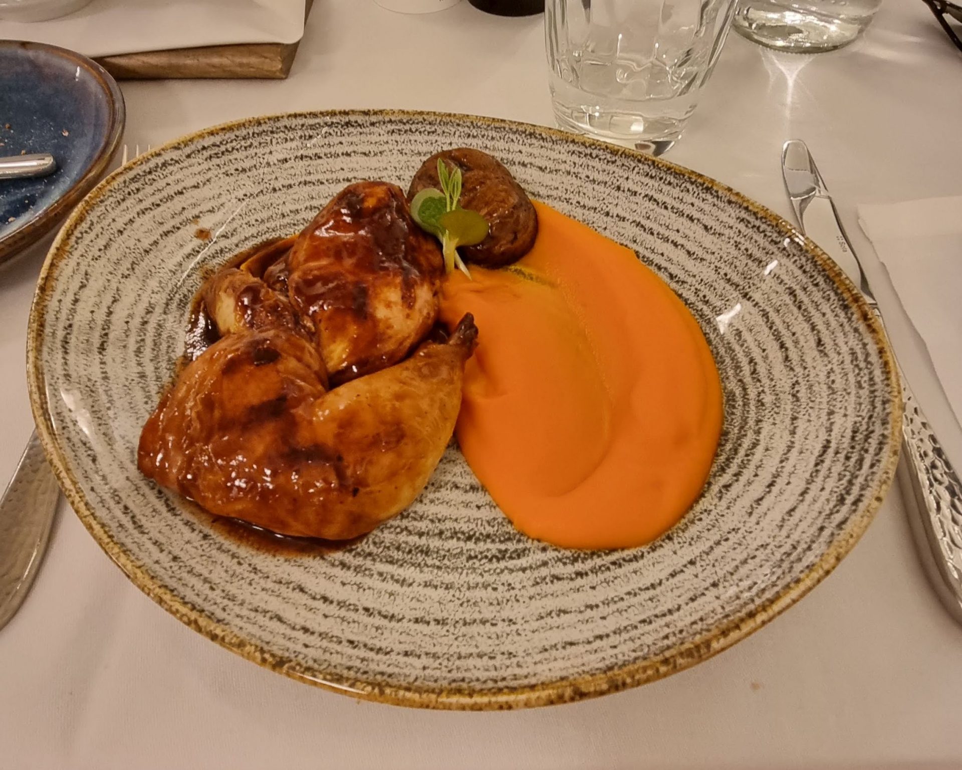 Eu am ales un puișor (coquelet) cu piure de morcov, Antonia a mers pe un biban de mare cu cușcuș. Cu tot cu o apă mare a costat vreo 200 de lei totul.