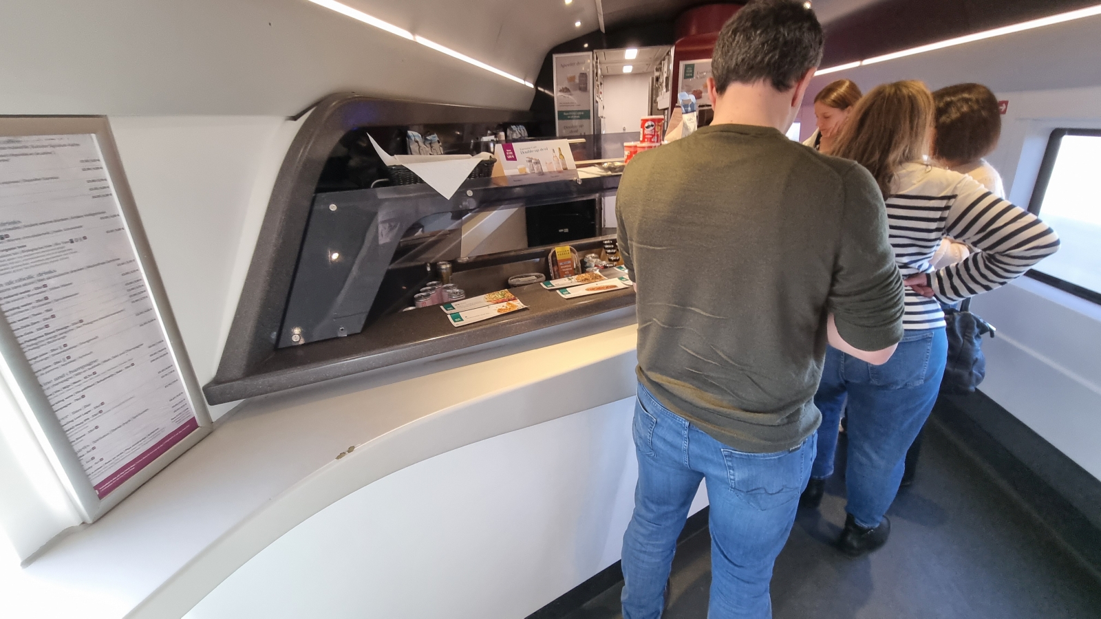 Am ajuns şi la vagonul restaurant, care e mai degrabă vagonul-butic. Sunt doar nişte sandvişuri şi salate, plus nişte chipsuri, sucuri şi alte câteva opţiuni, dar vorbim de un drum de două ore, nu de Orient Express totuşi.