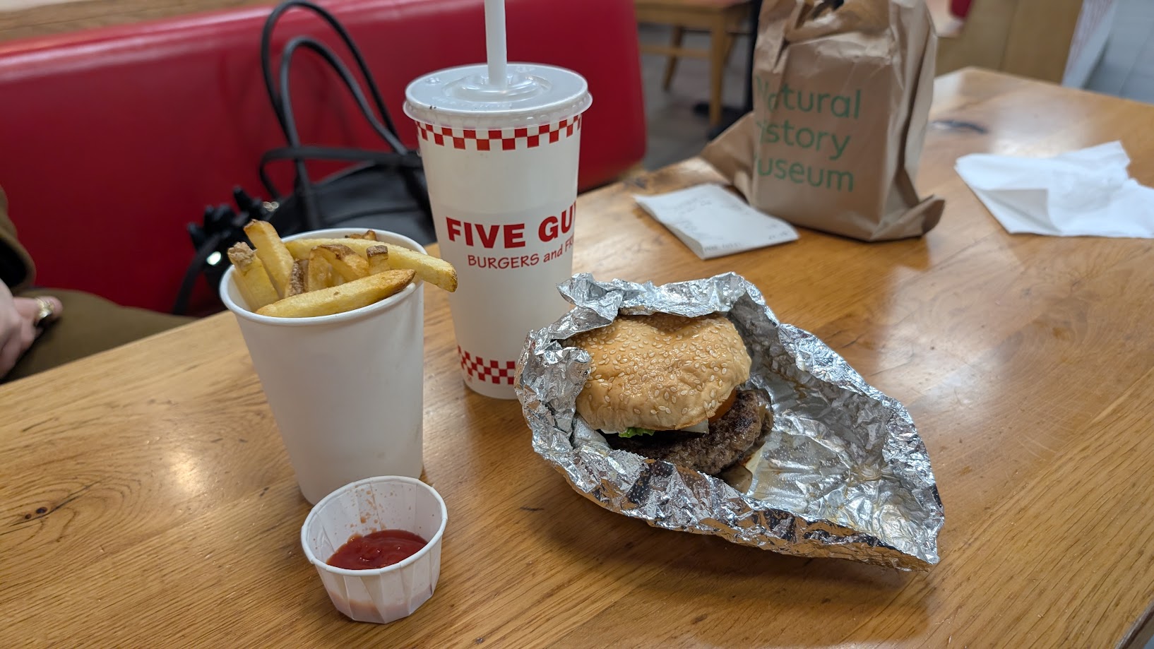 Așa că am luat un prânz la Five Guys, pentru că am auzit foarte mulți cunoscuți care laudă brandul ăsta apărut în 1986 în SUA. Abia în 2013 au deschis primul restaurant din afara Statelor Unite, la Londra, în Covent Garden. În prezent au peste 1700 de restaurante în toată lumea, fiind prezenți în Franța, Italia, Spania, Germania, Belgia, Marea Britanie, Austria, Cehia, Slovacia și țări de prin Asia.