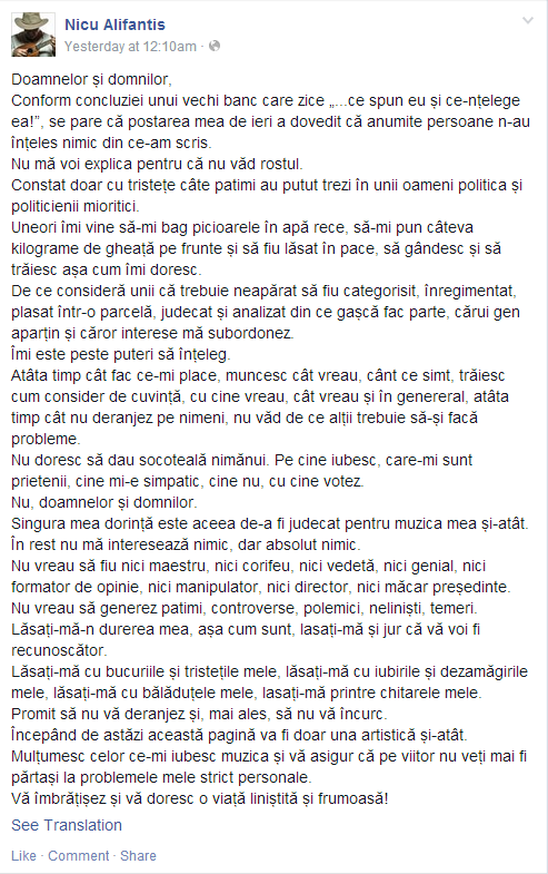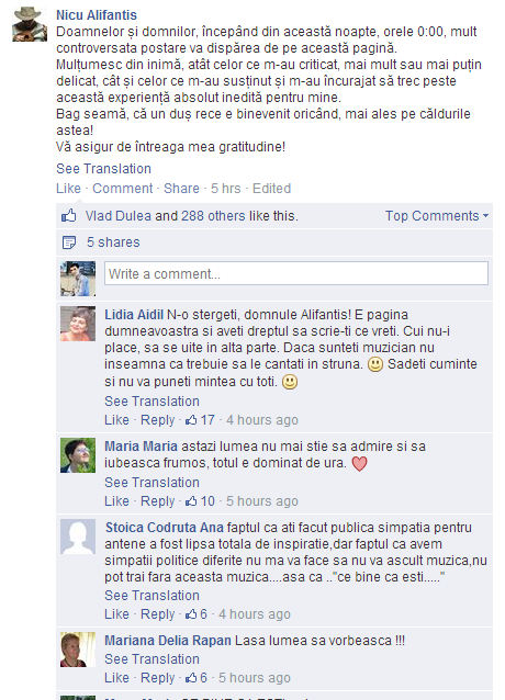 Pentru că nu-i nimic greşit ca Alifantis sau X sau Y să fie în sinea lor alături de Antena 3. Fiecare om are motivele şi argumentele lui, de orice fel or fi ele. Problema e când ajungi să comunici asta publicului, fanilor tăi. Şi e destul de răspândită situaţia, ţin minte că am întâlnit-o la un moment dat la o instituţie de cultură din Bucureşti care chema publicul în stradă ca să-l dea jos pe Traian Băsescu. Totul pentru că directorul respectivei instituţii era implicat în politică. Ăla ar fi fost momentul în care un specialist de comunicare ar fi trebuit să spună: „povestea asta nu intră pe canalele noastre sociale, domnule director!”.