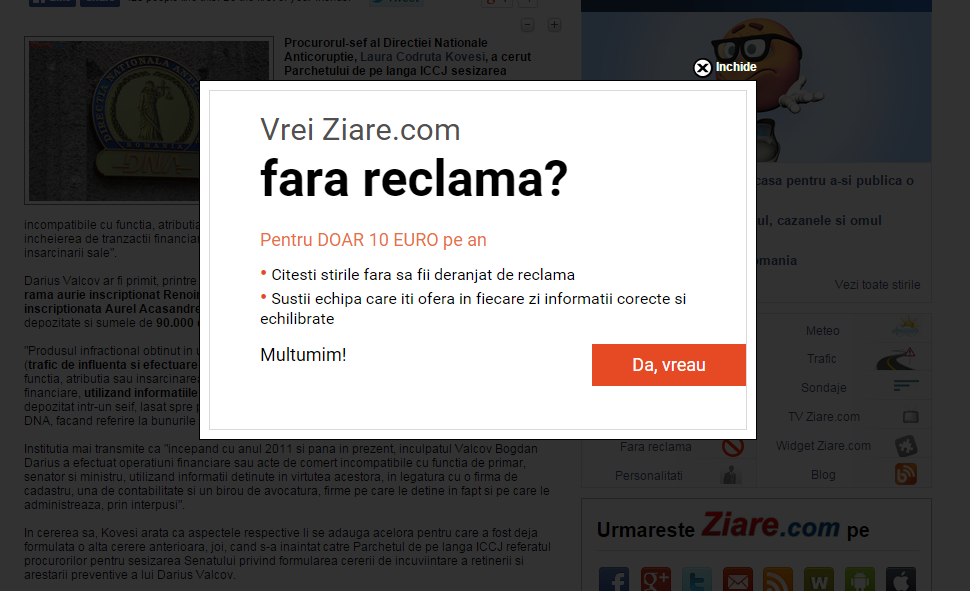 Ziare.com, unul din siteurile care nu s-au remarcat niciodată prin opinii argumentate, editoriale puternice sau anchete solide, ci mai degrabă prin spam şi content la kilogram, a introdus conturi plătite. Pentru că, nu-i aşa, paywall-urile merg de rup în România. 10 euro pe an e o glumă, mai ales în contextul în care AdBlocker este gratuit.