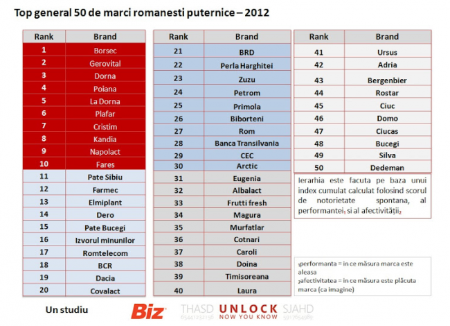 Joi a avut loc lansarea topului celor mai puternice 50 de branduri româneşti – ediţia 2012. Topul e realizat de Unlock Market Research la iniţiativa Revistei BIZ. O scurtă analiză legată de paginile de Facebook ale brandurilor din Top 10 găsiţi pe Marketing 2.0, iar topul este mai jos.