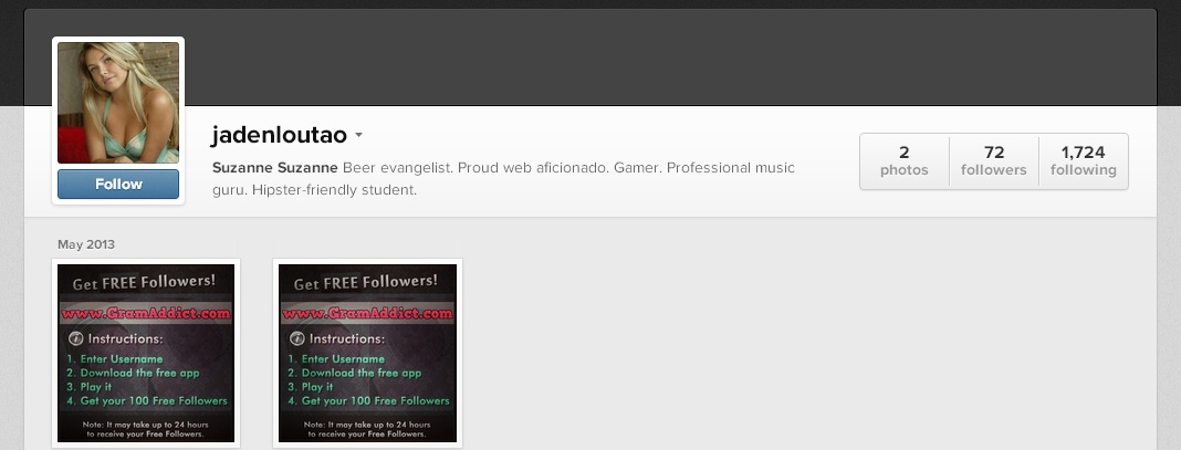 În ultimele 24 de ore am primit follow pe Instagram de la vreo 3 conturi cu aceleaşi poze. Ceva reclamă la Free Followers. Din ăia falşi, bineînţeles. La asta se adaugă şi conturile de tipul „saltele confortabile” care comentează pe la toate pozele cu „foarte frumos”.